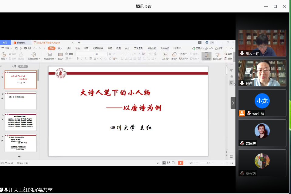 (通讯员:马丽 易喆)6月11日下午,四川大学文学与新闻学院中文系王红教授应邀在腾讯会议(会议号709325019)为我校师生作了题为《大诗人笔下的小人物——以唐诗为例》的学术讲座。此次讲座由bevictor伟德官网祁伟副教授主持,魏景波教授作点评,我校及外校的博士生、硕士生以及部分社会听众参加了此次讲座。