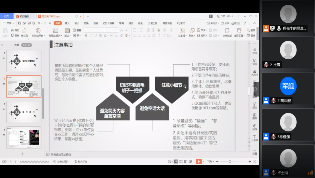 2020年5月6日、5月8日,辅导员程海峰通过视频分享和演示文档讲解等形式,对公费师范生和非师范生当前的就业形势做了基本介绍,为公费师范生解读就业政策,对非师范生详细讲解人事代理、灵活就业、大学生参军、 大学生到基层就业等就业类型。5月13日、5月15日程海峰分别对公费师范生和非师范生开展就业择业规划和答疑,重点围绕非师范生自主创业的优惠政策和公费师范生教育实习进行宣讲,并集中解答了就业过程中的常见问题。5月20日、5月22日,第三期就业指导课顺利开展,本周主要开展了诚信就业,就业市场与信息渠道的归纳分享和求职简历的制作方法。5月27日、5月29日,第四期就业指导课,程海峰为同学们讲解了面试的相关问题、我校的就业流程、毕业生离校以及报到的相关手续,着重强调了就业协议书的填写规范。