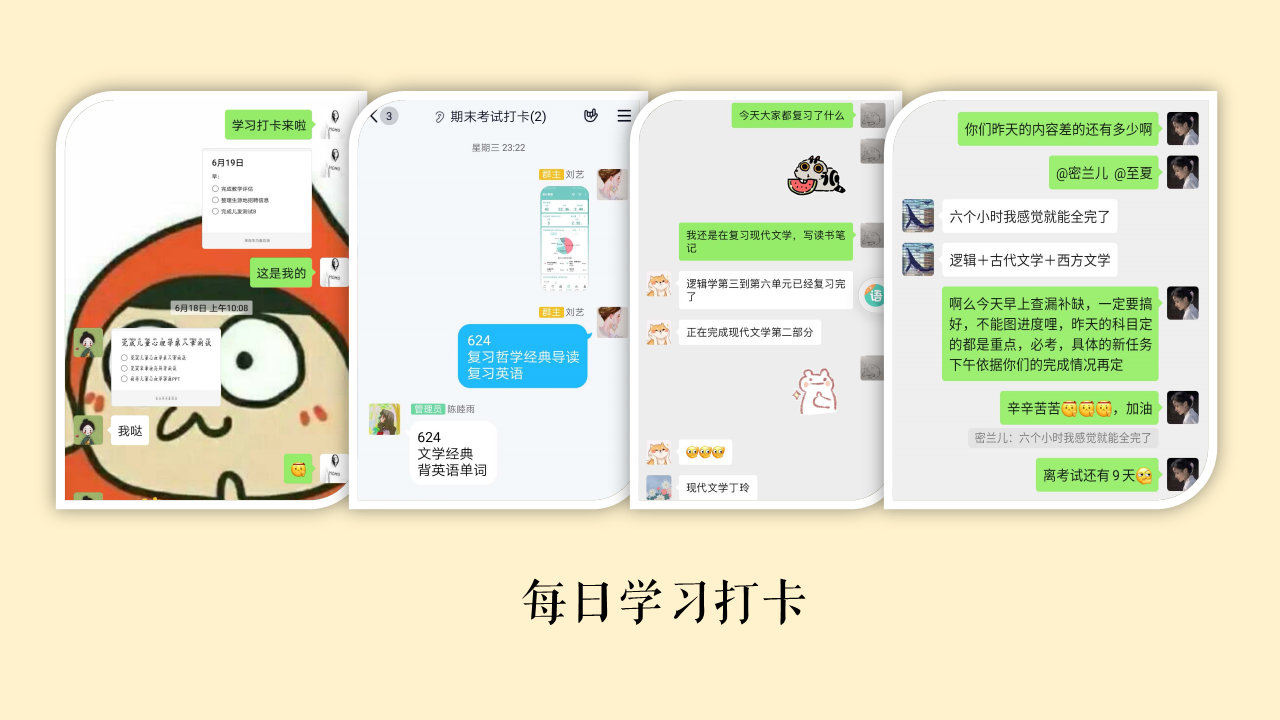 活动过程中,志愿者主动联系小组成员,学习小组通过共同制定学习计划、学习打卡、网络学习自习室、网络视频答疑解惑等方式开展了卓有成效的共同学习。在开展过程中,志愿者同学毫无保留地将自己的宝贵经验、学习方法、复习技巧教给小组成员,为他们制定复习计划,督促他们学习,了解他们学习的难处并提出解决意见,切实帮助了小组成员。