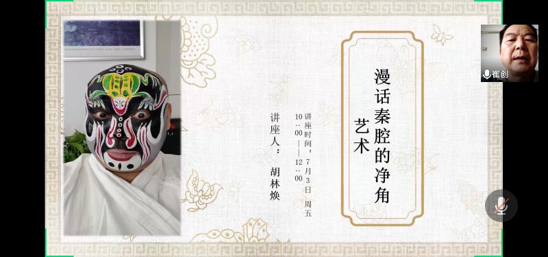 (通讯员:陈丹玉)7月3日上午10点至12点,国家一级演员、陕西省戏曲研究院眉户碗碗腔剧团净角名家胡林焕做客我校教育部中华优秀传统文化基地系列讲座,在腾讯会议平台精彩讲述《漫话秦腔的净角艺术》,三十余位观众在线观看。此次讲座由我校秦腔研究会会长崔创主持。