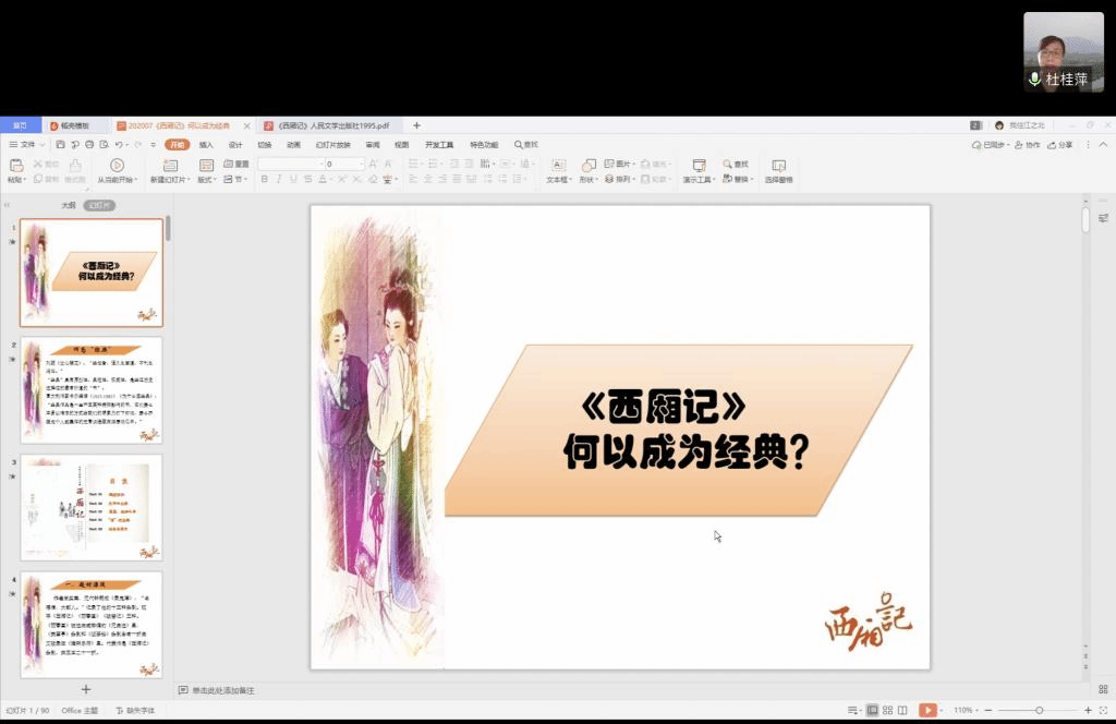 7月17日下午,bevictor伟德官网兼职教授杜桂萍为2020年“优秀大学生夏令营”营员做了题为“《西厢记》何以成为经典”的专题学术讲座。首先,杜桂萍老师列举了《文心雕龙》等典籍中对于“经典”的论述,指出经典应该具有原创性、典范性和权威性的特点。接着,她从“题材源流”“元曲四大家”“琵琶、西厢之争”“‘情’的主题”“刊本与演出”五方面对《西厢记》何以成为经典作了阐释。她指出,正是在对“元曲四大家”的讨论和对《西厢记》《琵琶记》高下的争论中,《西厢记》的经典价值得到了有效的挖掘,元代戏曲因之充分发挥了“土壤”和“武库”的作用。杜桂萍老师从多维的学术角度出发,对《西厢记》的巨大阐释空间作了讲解,并且提出了许多阅读经典的建议。