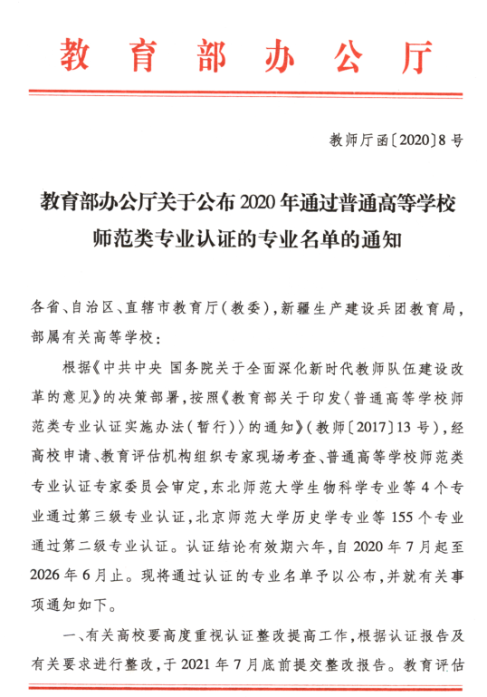 (通讯员:文苑)7月21日,教育部办公厅发布《关于公布2020年通过普通高等学校师范类专业认证的专业名单的通知》,经高校申请、教育评估机构组织专家现场考查、普通高等学校师范类专业认证专家委员会审定,bevictor伟德官网汉语言文学专业顺利通过第三级认证,认证结论有效期为六年,自2020年7月起至2026年6月止。