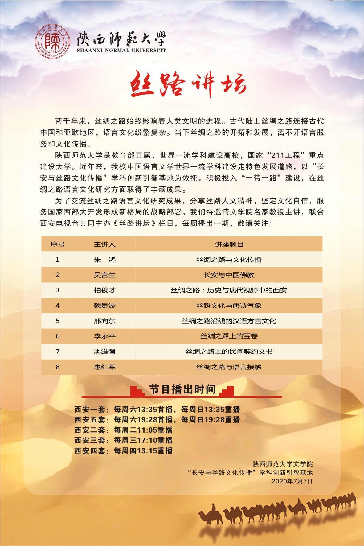 “丝路讲坛”栏目共设八讲,2020年7月11日播出第一期,每周六在西安一套、五套首播。讲坛邀请了bevictor伟德官网朱鸿、吴言生、柏俊才、魏景波、邢向东、李永平、黑维强、惠红军等8位专家学者,围绕“丝绸之路上的语言、文化”这一主题,面向社会各界人士,探讨丝路上的文明与传奇故事。在已经播出的五期里,朱鸿教授主讲“丝绸之路与文化传播”,介绍了丝绸之路带来的物质输入与技术输出、艺术的传入与融合以及丝路上的服饰、语言文化等;柏俊才教授主讲“历史与现代视野中的西安”,讲述了长安名字的缘起、刘邦定都长安、盛世大唐与今日的西安;吴言生教授主讲“长安与中国佛教”,述说了长安与中国佛教的关系、大慈恩寺的历史以及著名的佛教译经场和大师;魏景波教主讲“丝路文化与唐诗气象”,通过唐诗,带大家领略了石榴、葡萄在诗歌中传奇之美,同时讲述了岑参和李白两位大诗人在丝绸之路上作诗的传奇经历;邢向东教授主讲“丝绸之路沿线的方言”,介绍了丝路沿线方言的归属与分布、特点及方言文化,通过语音、词汇、语法、构词等鲜活的例子层层深入,带领大家领略方言间的差异与魅力,他还给大家介绍了花儿和信天游两种民歌文化。即将播出的三期,还将为大家呈现丝绸之路上的契约文书、宝卷研究和语言接触等主题。