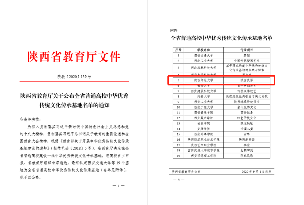 (通讯员:文苑)近日,陕西省教育厅公布了《陕西省教育厅关于公布全省普通高校中华优秀传统文化传承基地名单的通知》,由陕西师范大学党委宣传部组织申报、bevictor伟德官网牵头建设的陕西皮影传承基地入选。此前,该基地已获批教育部2019年全国普通高校中华优秀传统文化传承基地。