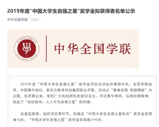 据悉,全国寻访“中国大学生自强之星”活动自2007年启动,每年评选一次,已连续举办了13届。2019年度寻访“中国大学生自强之星”由共青团中央、全国学联指导,中国青年报社、新东方教育科技集团联合开展。活动以“青春自强 刚健勇毅”为主题,自开展以来,受到广大高校师生的密切关注,经基层推荐、组织评定等环节,最终评选出“中国大学生自强之星标兵”奖学金获得者10名、“中国大学生自强之星”奖学金获得者2190名。