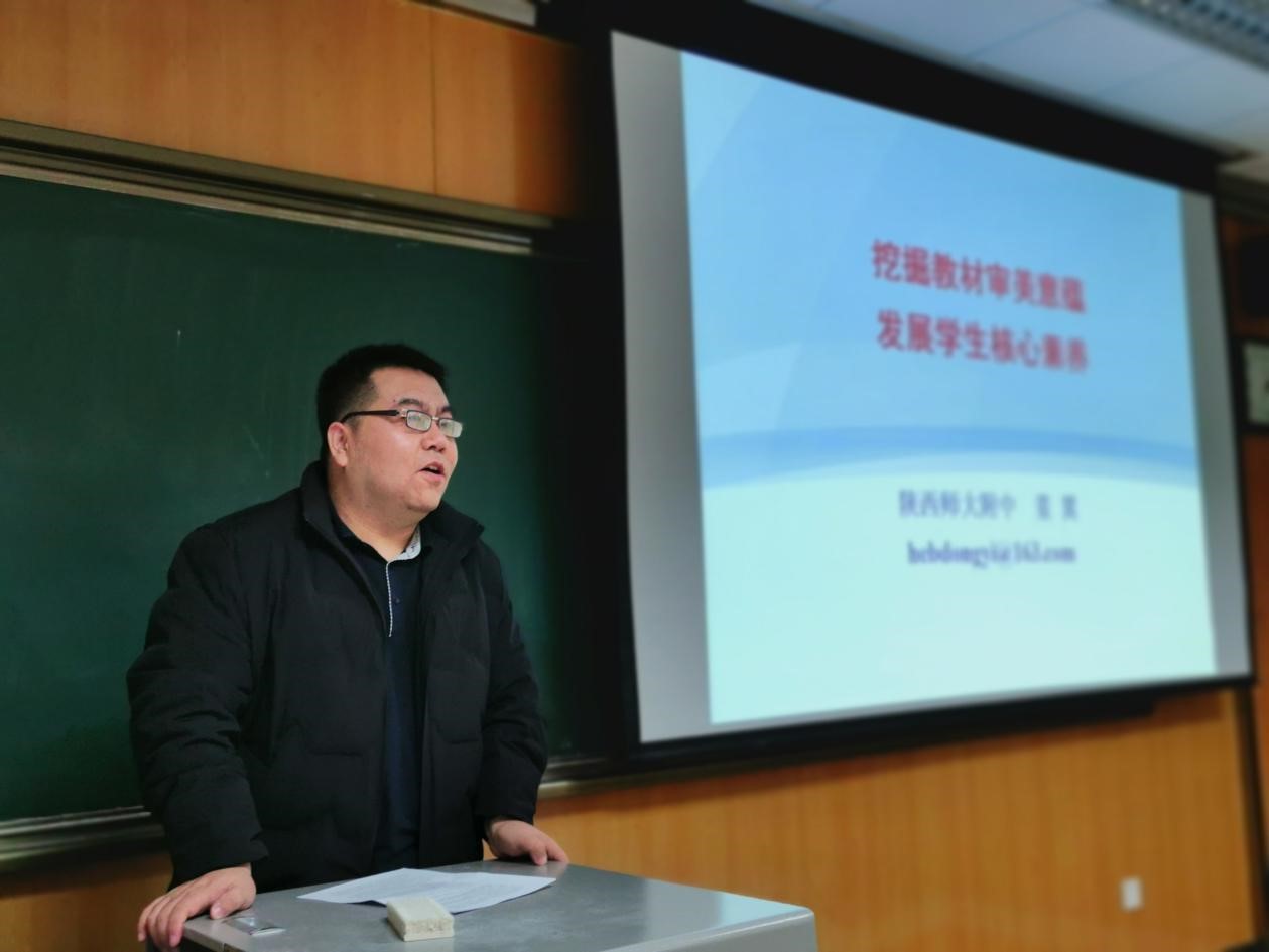 董老师从人教版初中语文教材新选文《国行公祭,为佑世界和平》的教学设计切入,组织了关于如何正确把握教学目标的交流活动,引导大家设计教学要立足课堂,立足教材,挖掘文本本身的审美意蕴。董老师非常形象地指出“教学不能只低头走路,还要抬头看天”,在带领大家共同研读国家教育政策文件及高中语文课程标准的基础上,董老师指出当前语文教学趋向互动式、启发式、探究式、体验式教学,注重情境化教学与项目式学习,并结合自己的成功经验及优秀教学案例,提出优化教学的一系列策略,鼓励大胆取舍、多方式灵活设计课型。他希望大家能不断拓宽教育视野,深入理解新版课程标准,为自身专业化成长及职业幸福的提升不断努力。