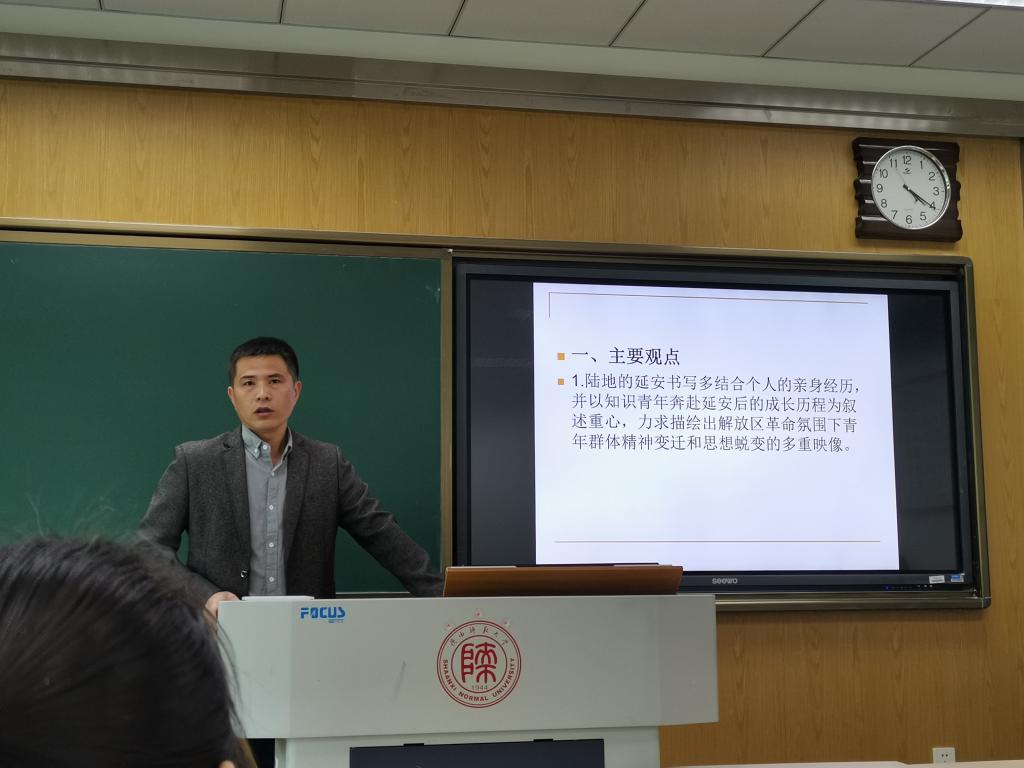 2021年4月28日,第214场博士学术报告以《陆地小说的延安书写》为题,由中国现当代文学专业博士研究生程志军主讲。程志军的报告以作家陆地奔赴延安后的个人经历和创作历程为切入点,以其不同时期完成的《叶红》《故人》和《一支金笔——浪漫的诱惑》三部作品为分析对象,力求厘清陆地的延安书写中所呈现的文本叙述策略。程志军指出这三部小说的叙述范式是渐趋开放的,陆地以独特的观察视角和叙述手法展现了青年人的命运变化,写出了富有张力的延安印象,实现了革命叙事主题与艺术探索的有效结合。