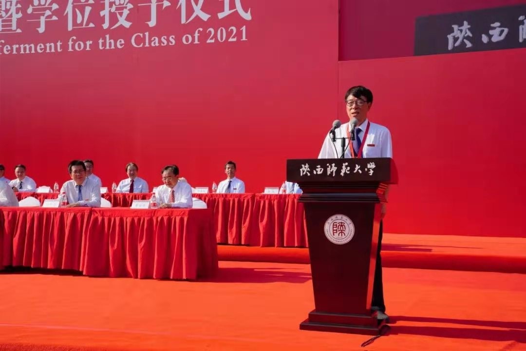 典礼大会上,作为发言人,尚永亮教授深情追忆了自己在母校的求学时光,畅谈了与同学尤西林、刘生良的大学情谊,并诚挚感恩培养自己的德高望重的老师——霍松林先生、高元白先生。他表示,陕师大优越的地理位置、卓越的师资力量拓展了自己的学习视野,涵养了自己的学术情怀,这段求学经历成为自己人生的新起点。作为一名陕师大的学生,在这样一个校园学习生活,理应感到无比光荣自豪!同时,他寄语毕业生:“追求卓越,接受平凡”,希望同学们在以后的人生道路中不忘母校的栽培,积极树立人生方向,踏踏实实做事。正如唐代诗人王湾所言,“潮平两岸阔,风正一帆悬”,期待2021届毕业生在未来人生中绽放华彩!