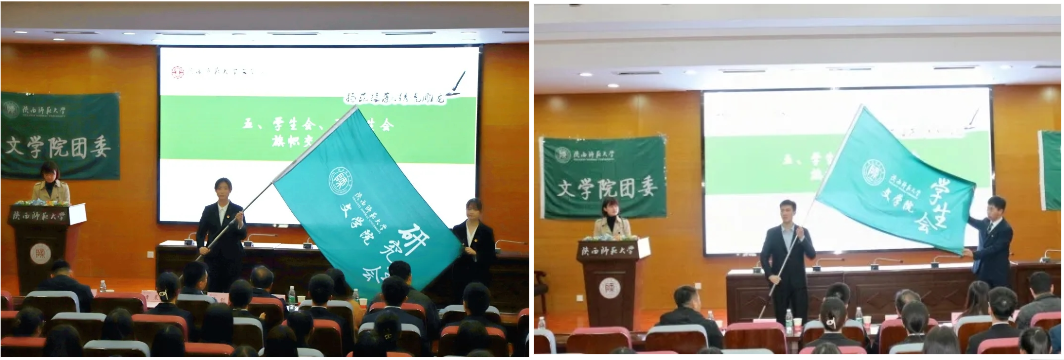 辅导员刘清华、黎佩璇、王鑫分别宣读了团委、学生会、研究生会、昭文融媒体中心、宿舍管理委员会、学生社团主要学生干部聘用决定。学生会、研究生会进行会旗交接。一面旗帜,一届传承;新的道路,新的使命。新一届学生干部将秉持“扬葩振藻,绣虎雕龙”的学院精神,以昂扬向上、脚踏实地的新气象开启新一年工作的进程。