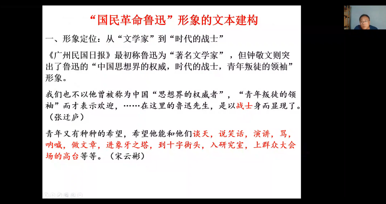 邱焕星教授围绕着《鲁迅在广东》一书,探讨了“国民革命鲁迅”形象。邱教授依次分析了文本的编选背景、“国民革命鲁迅”形象的文本建构、鲁迅与国民革命的关系、《鲁迅在广东》与“国民革命鲁迅”的解构、国民革命的意义与“鲁迅革命传统”的建构五个问题,展现了一个短暂存在的“国民革命鲁迅”形象,为鲁迅研究提供另一种阐释角度,对于思考鲁迅从革命人向革命同路人的转变有重要意义。邱教授的讲解条分缕析,娓娓道来,不仅内容别开生面,也带有方法论的启迪。