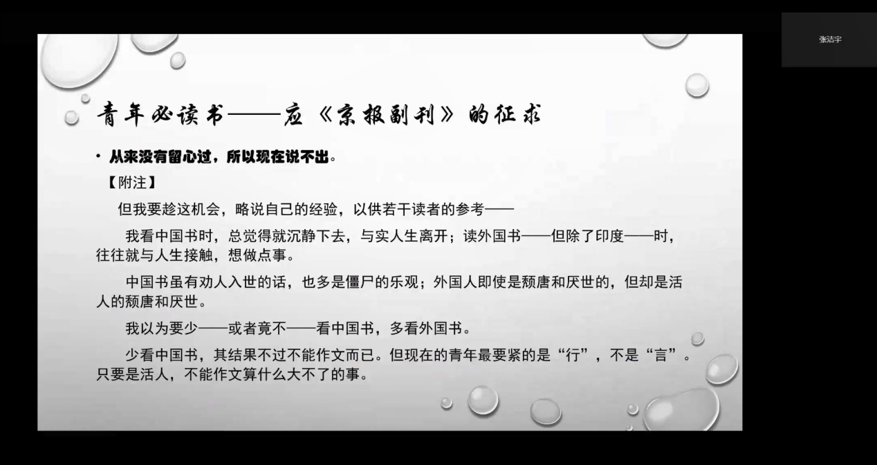 接下来四位教授逐一讲述。张洁宇教授由《青年必读书》入手,解读鲁迅的文学观和生死观。在《青年必读书》中,鲁迅提出“少读中国书”、“僵尸的乐观”等看似激进的观点,引发了争论。张洁宇老师认为,正确理解《青年必读书》不能断章取义,要理解其背后的话题,并理解当时的历史语境。《青年必读书》关注的是“活人”“怎么活”的问题。鲁迅的看法是,在当时的历史环境中,“行动”才是“活”的关键,也才是“大时代”中特殊的美学范式。在鲁迅的文学观中,对于艺术美的追求被他放在了现实性与行动性之后,这与他对于杂文文体的认识和实践是高度统一的。