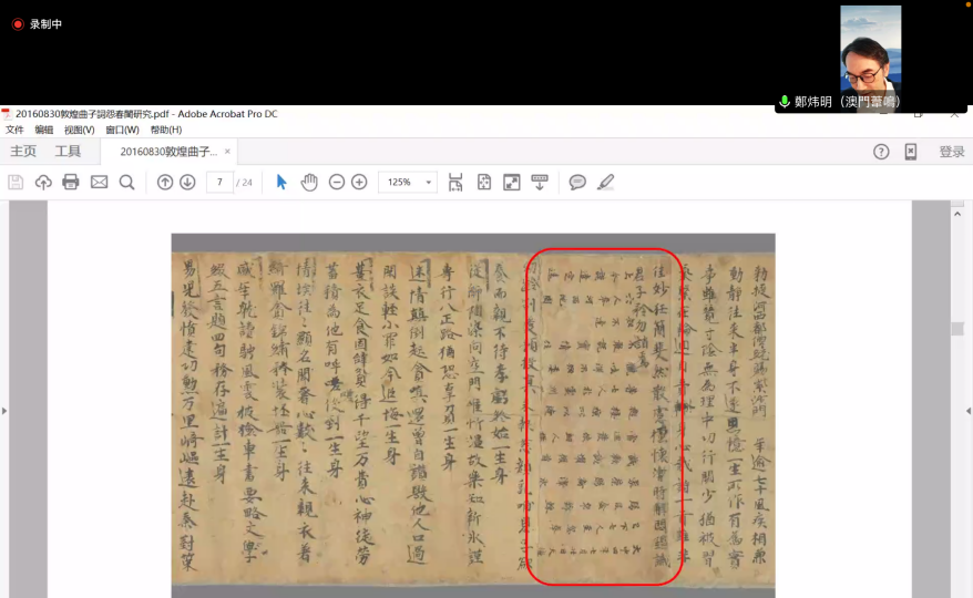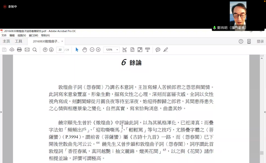 (通讯员:王君妍)2022年4月2日上午9:00-11:00,bevictor伟德官网以“交流·发展”为主题的文学文化系列讲座第二讲“敦煌曲子词《怨春闺》研究——从伯2748号卷子上的一条裂痕重新出发”于云端开讲。讲座由香港大学饶宗颐学术馆高级研究员、副馆长(学术)郑炜明主讲,bevictor伟德官网柏俊才教授主持,李占鹏教授点评。本次讲座受到学界高度关注,线上参会人数达百余人。