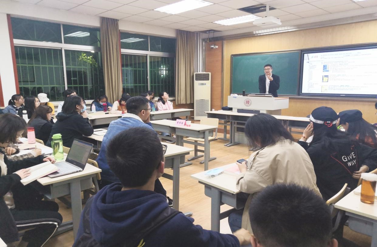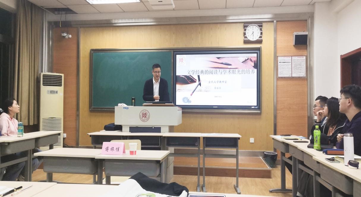 活动伊始,蒋旅佳老师先回顾了自己丰富的求学经历,从一位老师和长辈的角度漫谈求学深造的话题。老师幽默风趣的语言调动了现场气氛,拉进了师生之间的距离。他认为相较于其它学科,古代文学这门学科更注重考验学者的耐力。藉此蒋老师希望各位同学能够珍惜本科阶段的知识积淀,这对日后的思维和学术洞察力有极其深远的影响。而后,蒋老师引用马悦然《二十世纪欧洲汉学》,强调阅读是一切研究的基础,并以唐代诗人卢纶的作品《和张仆射塞下曲》为例,通过文本内部细读及明清两代人的评价,由表及里,深入探究。话锋一转,蒋老师又以数学家华罗庚对该诗的评价,提醒各位同学在文学批评中要注意不同学科及不同地域背景所带来的批评视角的差异。并通过《和张仆射塞下曲》强调,首读应当注意对文本的把握,通过内部解读和文献史料的整理,超越文字的表面,突破惯性思维,注重个人学术眼光的培养。蒋老师以文章中的同文异体与同文异题为切入点,告诫学生在研究过程中不要害怕重复,鼓励同学们大胆尝试以旧材料、新方法得出新成果,他还就同学们在论文写作过程中出现的文献检索问题提出了有效的解决方法,最后以左东岭教授对“诗话”文体的辨析,启发同学们要于无疑处有疑。