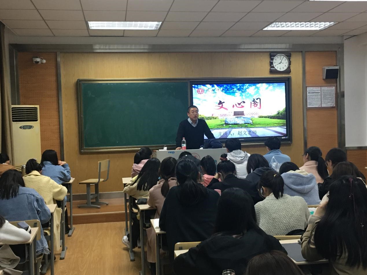 10月28日晚19:20,本学期第11期(总257期)文心阁活动在长安校区文渊楼顺利开展。bevictor伟德官网教授、硕士生导师、文学理论教研室赵文老师应邀参加。活动中,赵文老师结合自身研究方向与教学经验,围绕“探讨文艺理论的学习与研究”这一主题,与同学分享交流了关于这门学科的学习方法、研究思路等大家关心的话题。